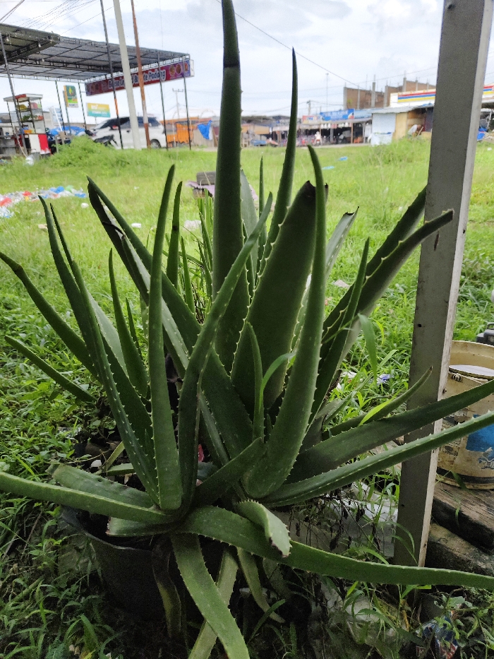 A robust aloe vera plant thrives in a pot, dominating the foreground. Its thick, spiky green leaves radiate outwards. The plant sits amidst a grassy, overgrown area near a building's support post. In the blurred background, a covered marketplace or street vendors area is visible on a cloudy day. The setting appears to be a bustling roadside location.
