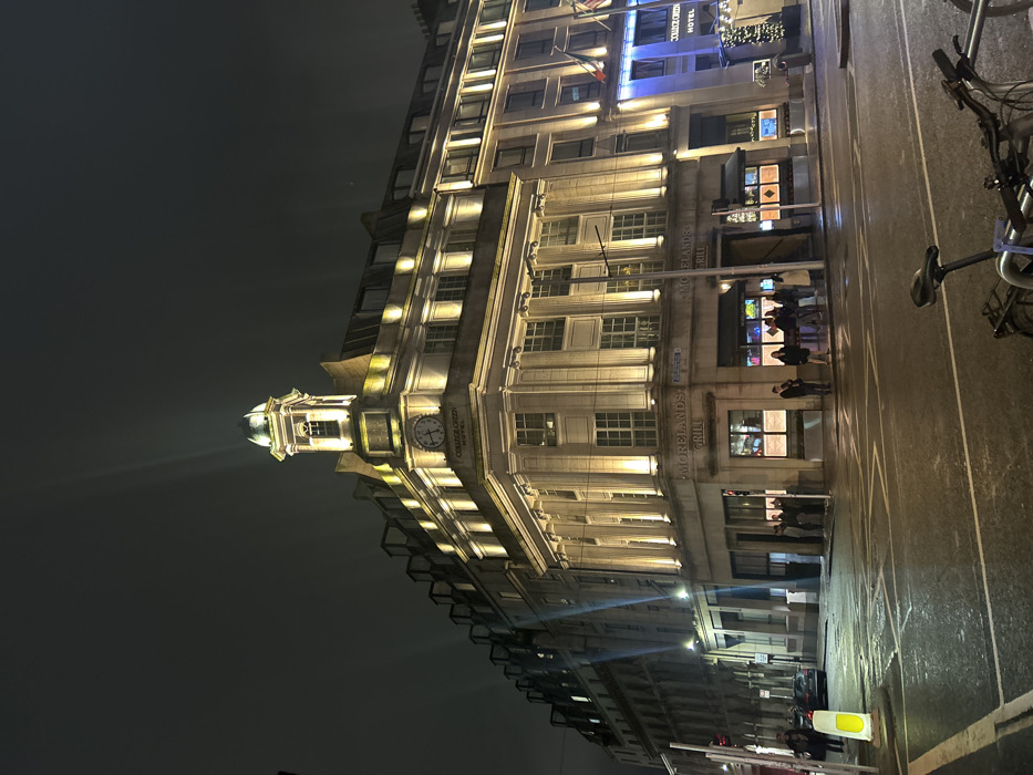 A nighttime shot displays a building with illuminated windows. The corner structure boasts a clock tower emitting a beam of light. The sign reads "College Green Hotel & Morelands Grill." People congregate near the restaurant entrance. Streetlights dot the scene, reflecting off the wet street. Bicycles are parked on the right side.