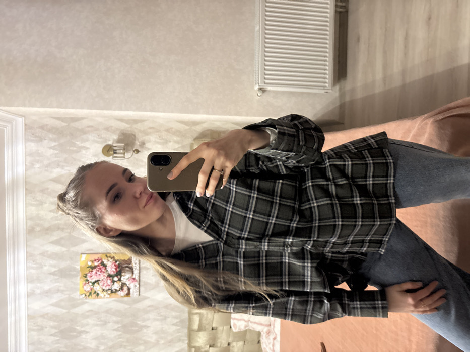 A female individual is captured in a mirror selfie within an indoor room in Esenyurt, Turkey. The subject is positioned slightly to the left of the frame, holding a dark taupe-cased smartphone in her left hand, which is adorned with a ring on the fourth finger. Her long, light brown hair is partially tied up, with strands flowing over her left shoulder. She is wearing a white t-shirt underneath an open dark grey/green plaid long-sleeve shirt and light blue denim jeans. Behind the subject to the left, a portion of a bed with a light-colored, possibly upholstered headboard is visible, covered with a peach-colored blanket. Above the bed, a painting of pink and white flowers in a vase hangs on the wall. To the right of the painting, a gold-colored wall sconce is mounted. Further to the right, a white, horizontally-ribbed radiator is fixed to the wall. The walls are covered with light-colored wallpaper featuring a subtle geometric pattern, and white crown molding is present at the ceiling line. The room appears brightly lit.