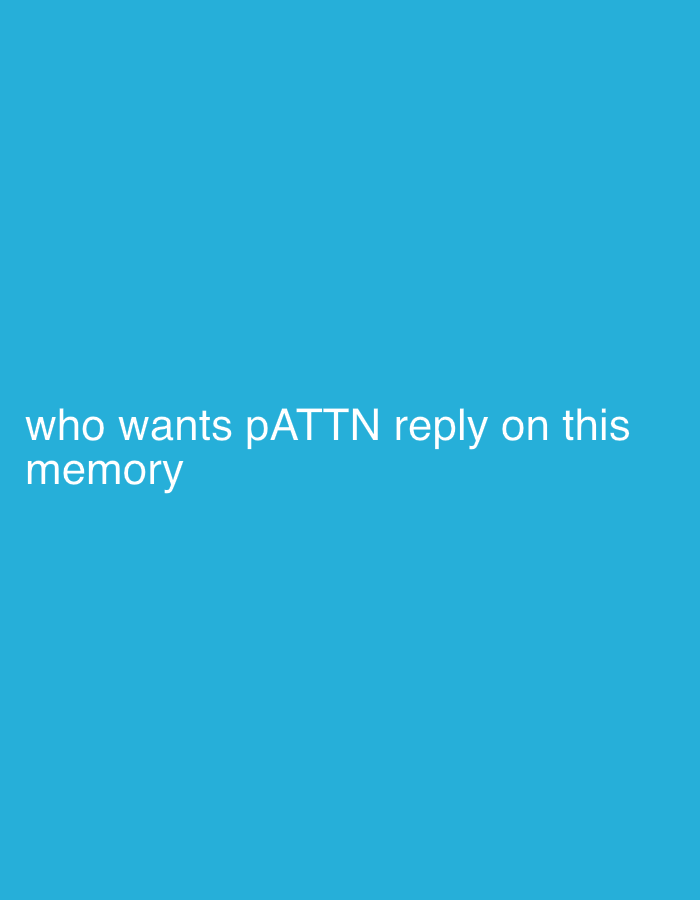 The image has a solid light blue background. White text is centered towards the bottom of the image. The text reads, "who wants pATTN reply on this memory". The words are stacked on top of each other. The font is a simple sans-serif.