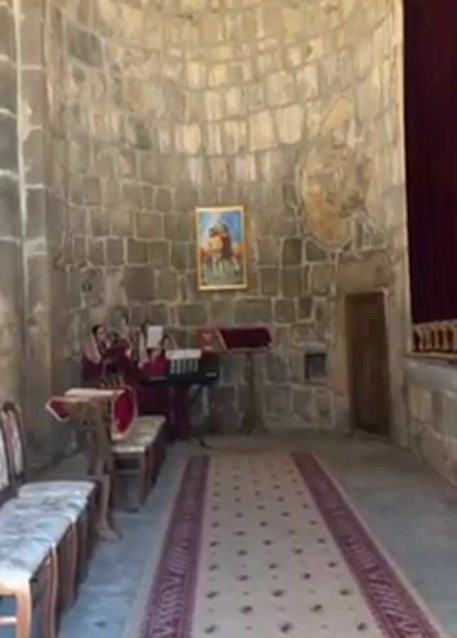Inside a small church, three women in red robes are performing music. One plays an electronic keyboard, another plays a woodwind instrument, and the third sings. The church has high stone walls in a rounded shape and a decorative chandelier. A red rug runs down the center aisle. A framed picture hangs on the wall behind the performers. Several wooden chairs are lined up on the left side of the aisle.