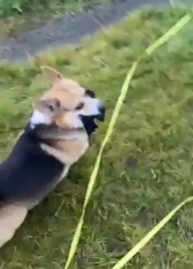 A Corgi dog is seen walking on a grassy area, carrying a black object in its mouth. The dog has white paws and a brown head with white and black markings. It is attached to a red leash, and a yellow leash is also visible on the ground. The camera moves slightly, following the dog's movement.