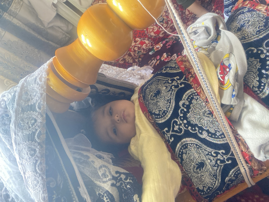 - "An infant is positioned supine within a traditional, possibly wooden, cradle or *beshik*, veiled by a light-colored, lace-trimmed netting" by FM-KOYye2, licensed under CC BY 4.0