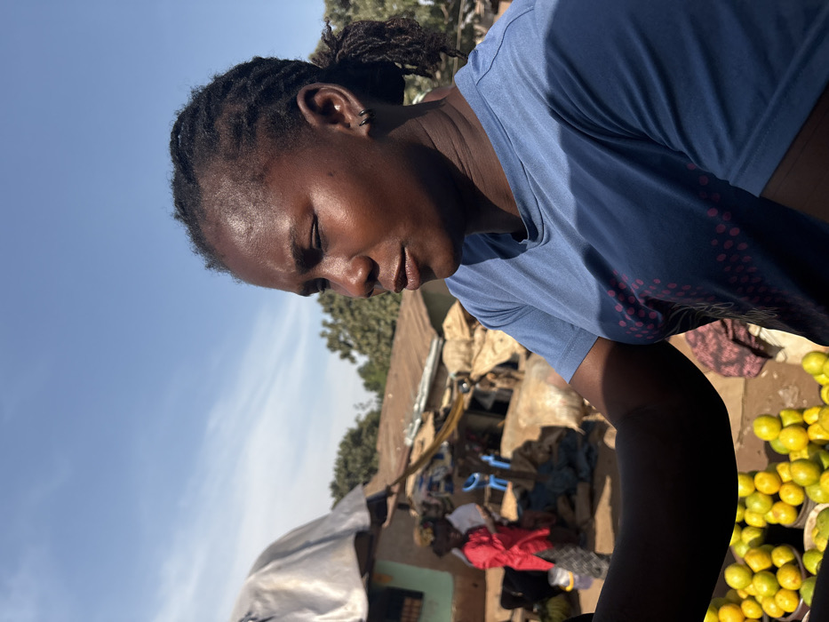 The image depicts an outdoor market scene in Karshi, Nigeria. In the foreground, a woman of African descent is captured in profile, facing right. She has dark skin, black hair styled in dreadlocks or braids pulled back, and wears a light blue short-sleeved t-shirt with a faint pattern on the chest. Her eyes are partially closed, and her expression is neutral. To her immediate lower left, a display of numerous yellow-green citrus fruits, likely oranges or limes, is visible in bowls or containers, indicating a vendor's stall. In the mid-ground, a cluttered backdrop consists of multiple structures. To the left, a light-colored building is partially covered by a gray tarp. Further back, several rudimentary buildings with corrugated metal roofs and walls are present. One individual, wearing a bright red top and patterned trousers, stands near the left mid-ground structures. Another person is partially visible behind them. The background also features green trees under a clear, bright blue sky with sparse clouds, suggesting a sunny day. The scene is illuminated by strong natural light, casting distinct shadows on the foreground subject and surrounding elements.