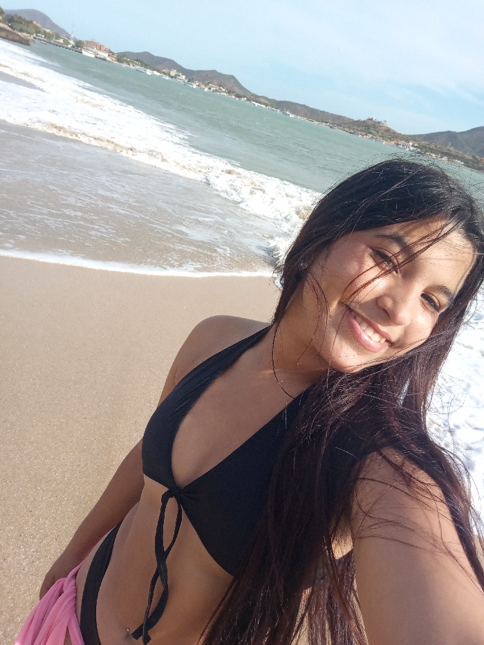 A young woman in a black bikini smiles at the camera on a sunny beach. Her long, dark hair falls across her face. Behind her, gentle waves roll onto the tan sand. A pink garment is partially visible around her waist. In the distance, a bay is lined with buildings and green hills, all under a light blue sky with faint clouds.