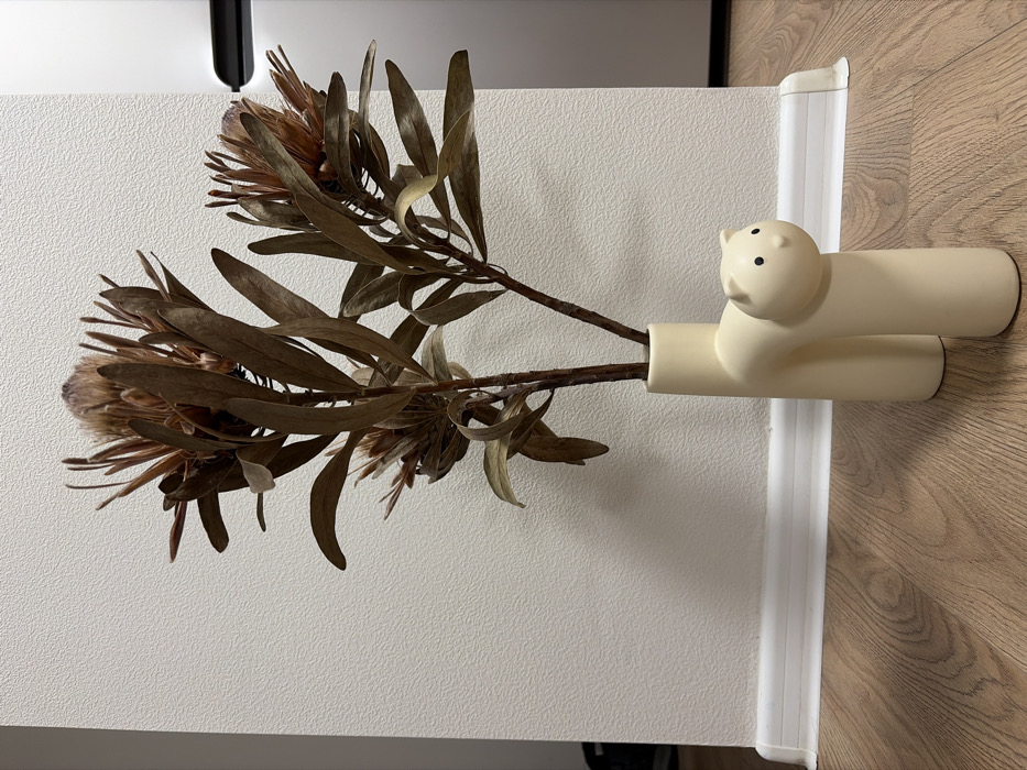 Two dried protea flowers sit in a creamy white, anthropomorphic vase. The vase, shaped like an abstract animal with a rounded head, rests horizontally against a white refrigerator and a light wood grain surface. A white, corrugated edge protector is positioned between the refrigerator and the table. The room's lighting casts gentle shadows on the surfaces.