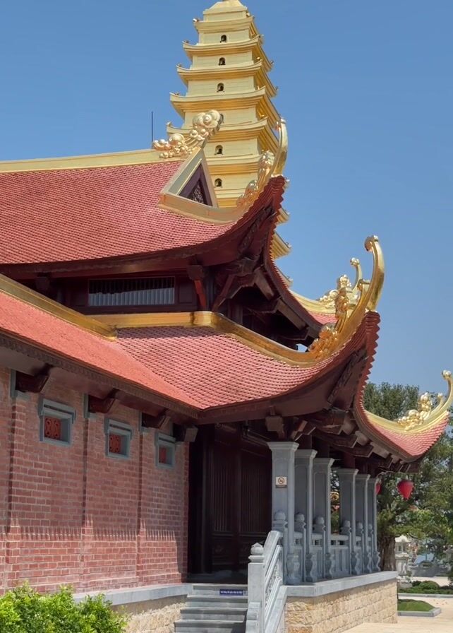 n outdoor view of a traditional Asian temple or building, possibly in Vietnam, during a sunny day. The building features a brick facade, a red-tiled roof with elaborate, golden ornamental edges, and dark wooden doors. In the background stands a multi-tiered golden tower. The camera slowly pans to the right, revealing a landscaped garden with paved pathways, green trees, and a white patio umbrella. The sky is clear and blue.