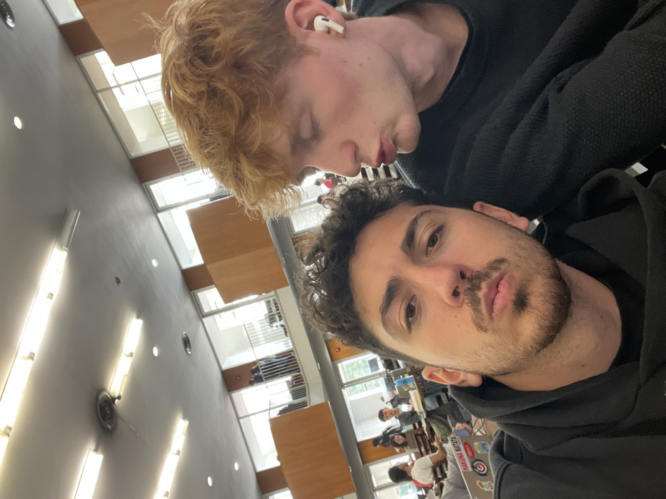 The image captures two males taking a selfie in a multi-level university common area or library located in New York City, United States. **People:** In the immediate foreground, a male with dark, curly hair and a short beard, wearing a black hooded sweatshirt, looks directly into the camera with slightly pursed lips, holding the device to capture the image. To his right, partially cropped, another male with reddish-blonde curly hair wears a dark, long-sleeved garment and a white wireless earbud in his right ear. He poses with his lips pursed into a distinct pout, looking away from the camera's direct line of sight. In the background, approximately ten to fifteen additional individuals are visible, seated at tables on the main floor and on an elevated mezzanine level. They appear to be engaged in various activities, including looking at laptops or conversing, indicative of a study or social setting. **Objects and Environment:** The indoor environment features a high ceiling with multiple rows of rectangular fluorescent light fixtures and several circular recessed spotlights. Large windows spanning the back wall allow natural light into the space. The area is furnished with wooden tables and chairs. On a table in the mid-ground, a laptop is visible, bearing "HAKUNA MATATA" and "PRENTS" stickers. The interior architecture includes a visible upper mezzanine level with a metal railing and prominent wooden partition walls. The overall aesthetic is consistent with a modern academic institution's common space.