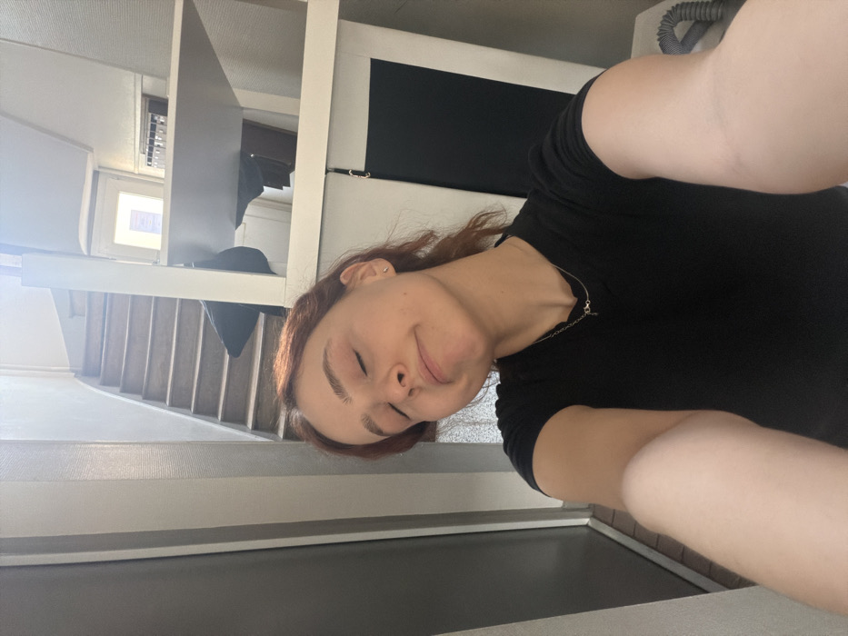The image depicts an interior space within a building located in Reims, France. A female subject, appearing to be a young adult, occupies the foreground, facing the camera with her right arm extended, holding the imaging device. She has reddish-brown hair, eyes closed, and her lips are pursed. She wears a plain black, short-sleeved top and a thin, silver-colored necklace with a small pendant. A small metallic stud is visible in her left earlobe. The background features a light-colored wooden staircase ascending from left to right. Adjacent to the staircase on the right, a white shelving unit is visible, holding dark rectangular objects on an upper shelf and a dark textile draped over a lower shelf. Below the shelving unit, a grey coiled cable and part of a grey electronic device are present. The walls are light grey, and the scene is brightly illuminated by light entering from an unseen source on the upper right.