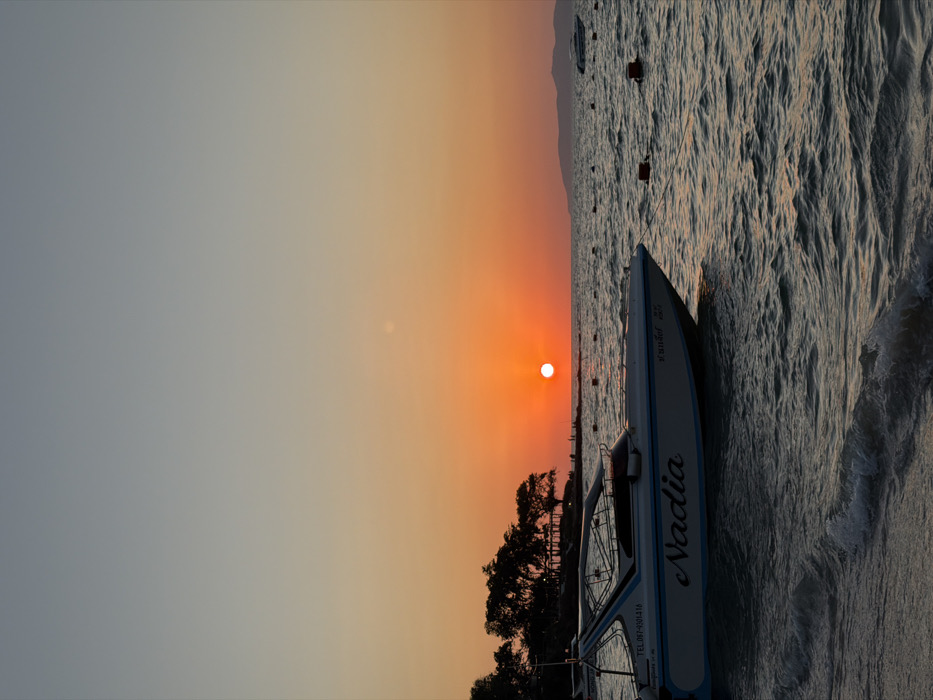 The image depicts a coastal sunset scene, identified as Pattaya City, Thailand. The sky transitions from light blue-grey at the top to a vibrant orange-red at the horizon, where a distinct, bright orange sun is centrally positioned. The ocean surface, dark blue-grey, exhibits ripples and small waves, particularly in the foreground, breaking onto a dark, indistinct sandy shoreline visible at the bottom left. A white speedboat with light blue trim, named "Nadia" in dark blue script on its hull, is partially in the water near the foreground, its bow pointed towards the right. Thai script "น.ช่างยนต์ 27" and a telephone number "TEL. 067-9301416" are also visible on the boat. Multiple dark orange and black cylindrical buoys are scattered across the water in the mid-ground. On the left side of the horizon, a dark silhouette of a landmass is visible, featuring several trees and numerous small, indistinct human figures observing the sunset from the shore. Further to the right on the horizon, a hazy, darker landmass is present, with a smaller white boat visible in the water in front of it. No specific actions or interactions are clearly detailed beyond the people's presence on the distant shore.