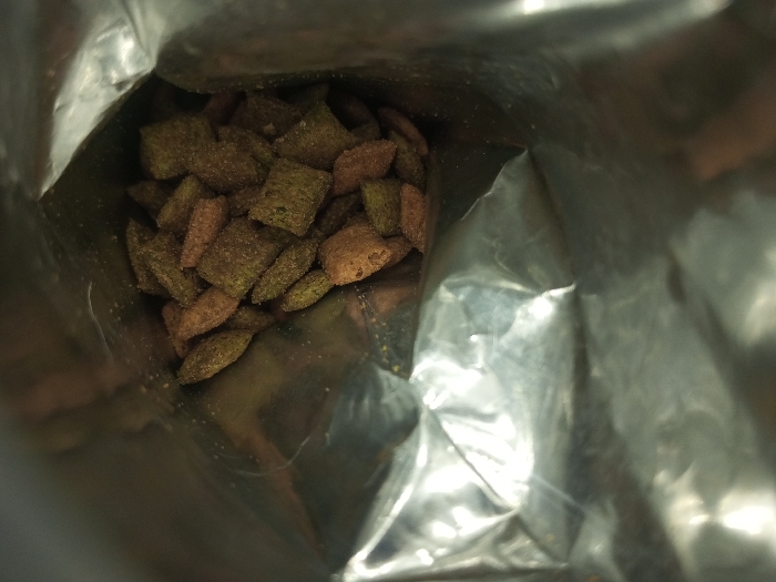 close-up, interior view of a shiny, metallic bag, possibly made of foil. At the bottom, a pile of small, irregularly shaped pieces, likely food, are visible. These pieces are primarily green and brown, suggesting a mix of ingredients. The lighting creates strong highlights and shadows on the bag's surface, emphasizing its crumpled texture. The overall composition focuses on the textures and colors within the bag's limited space.