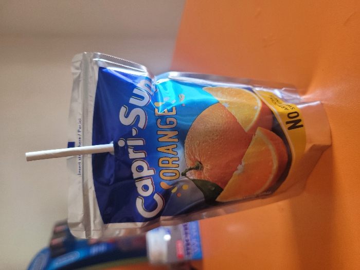 - "A Capri-Sun Orange juice pouch is centrally positioned on an orange, smooth surface" by FM-3dVQN2, licensed under CC BY 4.0