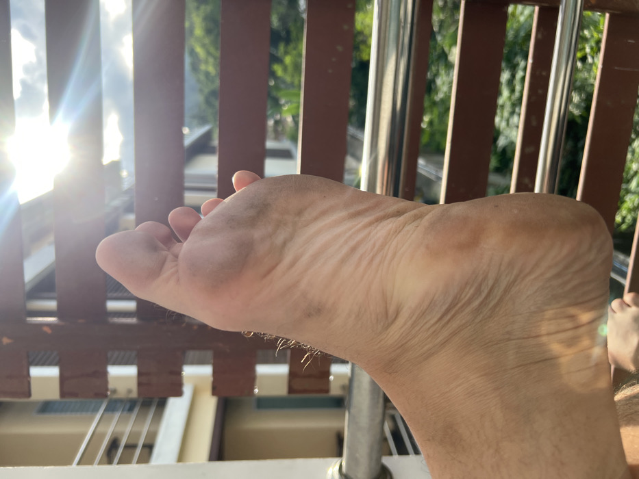 A human left foot, viewed from the sole, is prominently featured in the foreground against a sunlit background in Baan Bo Phut, Thailand