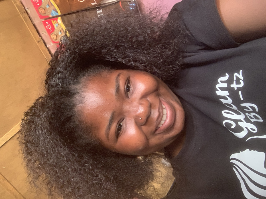 The image depicts a close-up, head-and-shoulders view of an adult female in an indoor commercial setting, likely a hair salon or beauty supply shop, in the city of Garaku, Nigeria. The individual, of dark skin tone, is smiling directly at the camera, revealing teeth. She has full, dark, curly hair and wears a small silver-colored nose stud in her right nostril. A gold-colored earring is partially visible in her left ear. She is dressed in a black t-shirt featuring a white graphic of a woman's profile with flowing hair, alongside the white text "Glam By_tz". The background consists of a wooden beam across the top. To the right, two vertical banners or posters are visible; the upper one displays the word "LUSH" and an image of a woman with light-colored hair, suggesting hair product advertisements. The wall behind the banners appears light pink. The left side of the background is obscured by the subject's hair, with a small portion of a gold-brown surface visible.