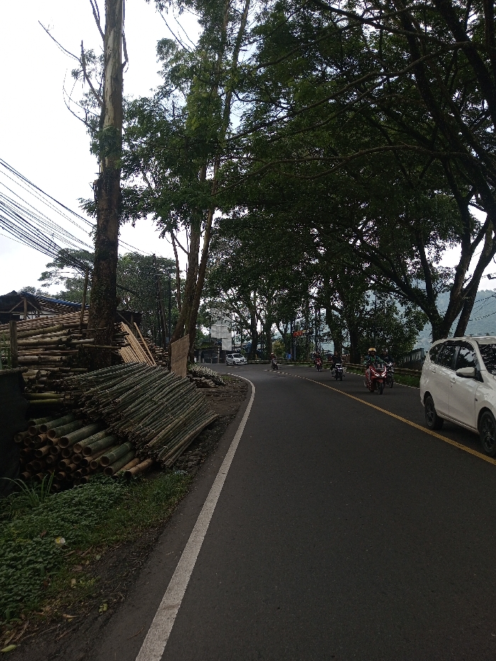 The image depicts an overcast daytime scene of a curving asphalt road in what is identified as Sandamal Eliya, Sri Lanka. On the immediate left, a large quantity of cut bamboo stalks, varying in color from green to light brown, are stacked horizontally and vertically along the roadside, extending into the midground. Behind these stacks, the upper portion of a wooden-roofed structure is partially visible. A tall, slender tree stands prominently on the far left, supporting multiple utility lines that traverse horizontally. The road, dark grey with a solid white edge line on the left, curves to the right in the midground, where a dashed yellow center line is partially discernible. Numerous tall trees with dense green foliage line both sides of the road, forming a natural canopy overhead. In the midground, several individuals are operating motorcycles, all wearing helmets and dark clothing, traveling away from the viewer. One white passenger van/SUV is positioned on the right side of the road in the midground, and a white sedan is visible further down the road on the left side of the curve. A mountainous or hilly terrain is visible in the distant background on the right, partially obscured by trees. The sky is bright white, indicating overcast conditions.