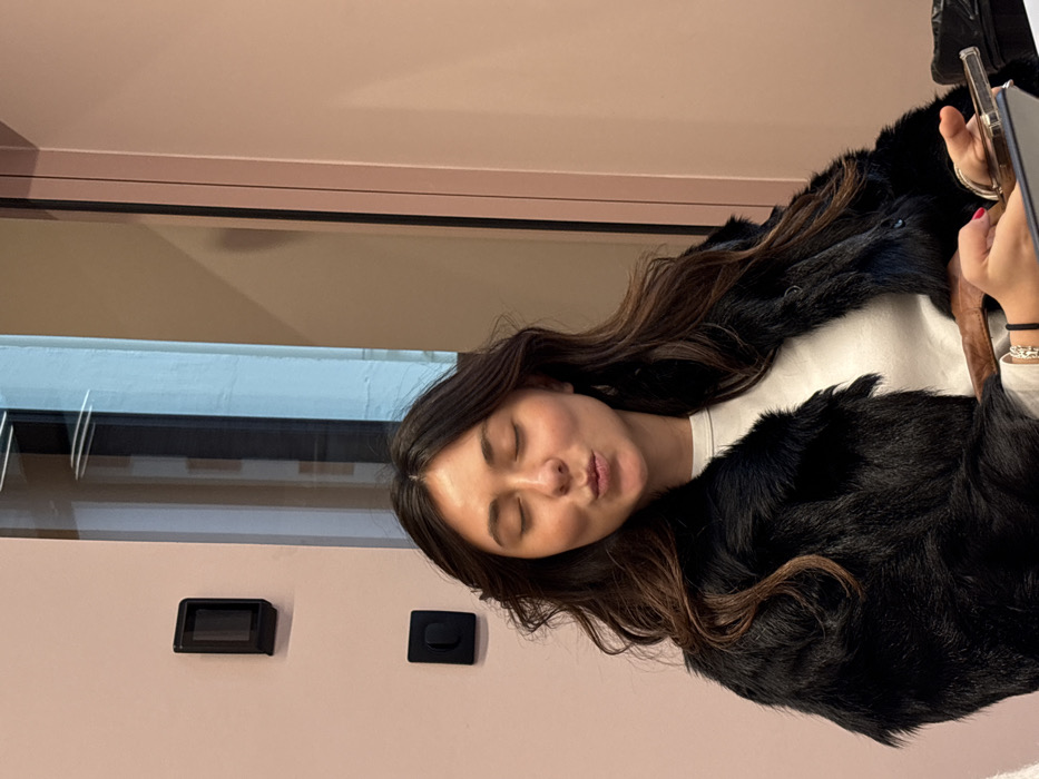 A female subject with dark, wavy, shoulder-length hair is captured from the chest up, facing forward with eyes closed and lips pursed in a "kissing" expression. She wears a black fur coat over a white long-sleeved top. A silver bracelet is visible on her left wrist. Her hands, positioned in the lower right quadrant, hold a dark electronic device, possibly a tablet, with a metallic object resting on it. Her fingernails are painted red. The background features a light pink wall on the left, displaying two vertically mounted black rectangular fixtures. A vertical glass panel, reflecting a bright blue light and horizontal lines, separates the pink wall from a light brown wall on the right. The setting appears to be a modern indoor environment. The exact location within Paris, France, cannot be determined from the provided image.