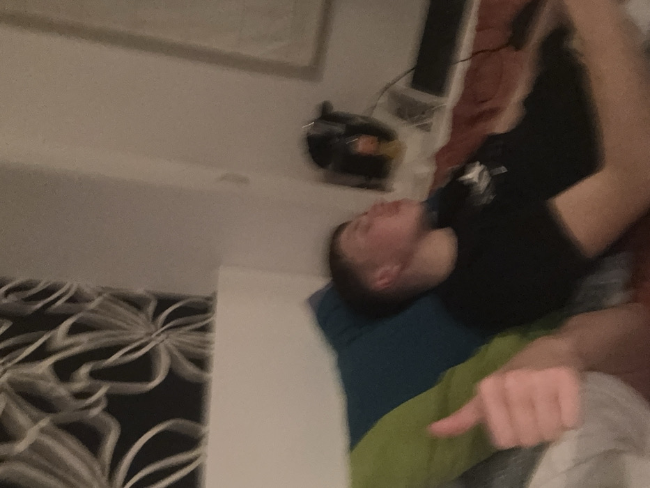 The image depicts an indoor scene, likely a bedroom, located in Kladnitsa, Bulgaria. A young male individual, appearing to be in his late teens or early twenties, with short light-colored hair, is partially visible in the mid-ground. He is positioned on a bed, reclining against a blue pillow, wearing a dark t-shirt. His head is turned slightly to the right, presenting his profile, and his eyes appear closed or cast downwards. To the left foreground, a human hand is visible, extending from another individual not fully pictured, performing a "thumbs up" gesture. The bedding includes a bright green pillow partially obscured by the hand, and the blue pillow supporting the male subject. A reddish-brown blanket or duvet covers the lower portion of the male. The background features a wall with dark wallpaper patterned with light-colored, abstract, or floral designs. To the right of the frame, a light-colored wall is visible, along with a dark electronic device resembling a speaker or soundbar, and a dark object with a light-colored base, possibly a lamp, situated on a surface. The overall image exhibits motion blur, affecting the clarity of subjects and objects.