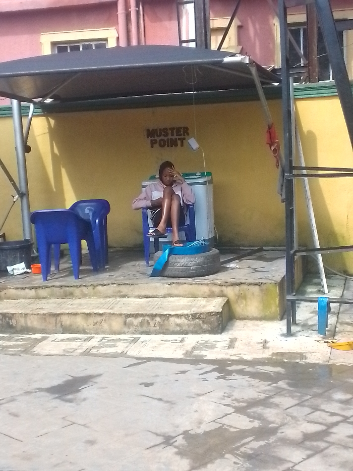 An outdoor scene is depicted in Unknown, Unknown, featuring a young female under a dark canopy structure adjacent to a building. The building's lower section presents a yellow wall with the words "MUSTER POINT" stenciled in black capital letters. Above this, a pink/red building with windows is visible. A lone female individual, with dark skin, is seated on a blue plastic chair, positioned on a raised concrete platform. She wears a light pink long-sleeved hooded top and dark shorts, with dark flip-flops on her feet. Her right elbow rests on her right knee, and her right hand supports her forehead, while her left arm rests on her left knee. Her ankles are crossed, and her feet rest on a black rubber tire that lies flat on the platform. A blue object is draped over the tire. To the female's left, two blue plastic chairs are stacked. Further left on the platform, a black bucket and a small orange bucket are present. To her right, against the yellow wall, stands a white and light grey top-loading appliance, possibly a washing machine. A small white rectangular object hangs by a wire from the canopy structure near this appliance. The canopy, dark grey or black, is supported by metal poles. On the far right, a metal ladder-like structure stands against the wall, from which a red cloth hangs. Another blue object is near its base. The ground in the foreground is paved with patterned concrete tiles, exhibiting multiple wet patches. Steps lead up to the raised concrete platform.