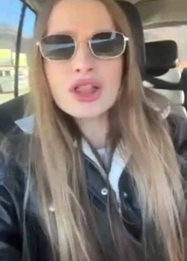 A young woman with long blonde hair is in a car. She is wearing sunglasses and a dark jacket. She appears to be talking and possibly singing along to music. The car is moving and the outside scenery is visible through the windows.