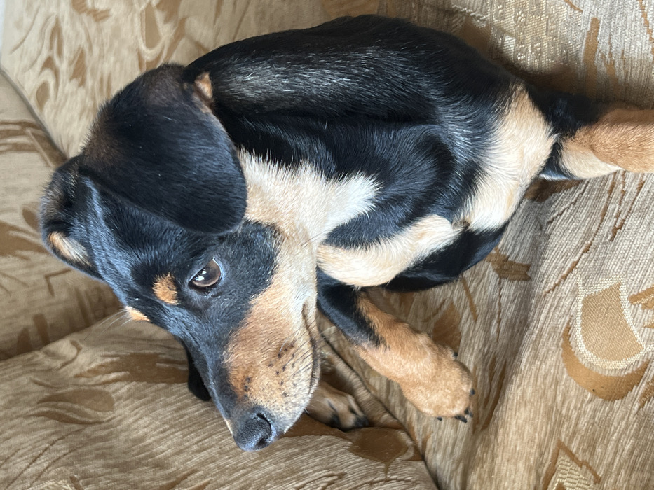 The image displays a short-haired dog seated on a patterned sofa, located in Krivodol, Bulgaria