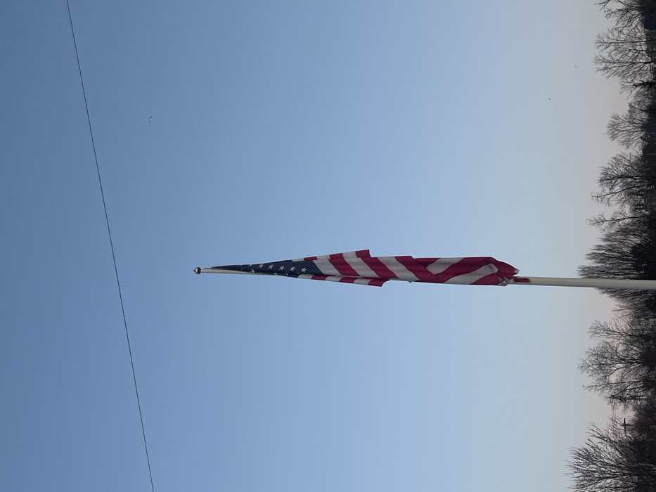 An American flag hangs vertically on a light-colored flagpole, situated in the center-right of the frame, beneath a clear, light blue sky in the Town of New Windsor, United States of America
