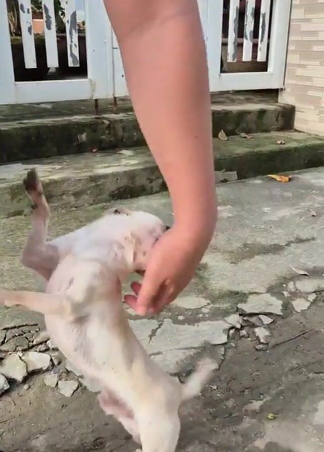 person petting a small, light-colored Chihuahua. The person is wearing dark shorts, a long-sleeved brown shirt, and blue sandals. The dog is standing on its hind legs, reaching up to the person. The person holds the dog for a moment, then puts it back down. The dog appears energetic and playful. They are standing on a concrete surface with cracks and some pebbles. In the background, there is a white fence and some greenery.