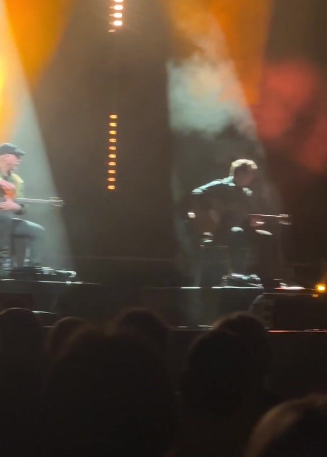 two men performing on a stage, playing acoustic guitars. They are seated on small stools in front of a crowd. The stage is dark, but illuminated by bright white and orange spotlights. There are vertical rows of small lights in the background. Smoke or fog is also visible on stage. The audience is visible as silhouettes in the foreground. The musicians appear to be deeply engaged in their performance.