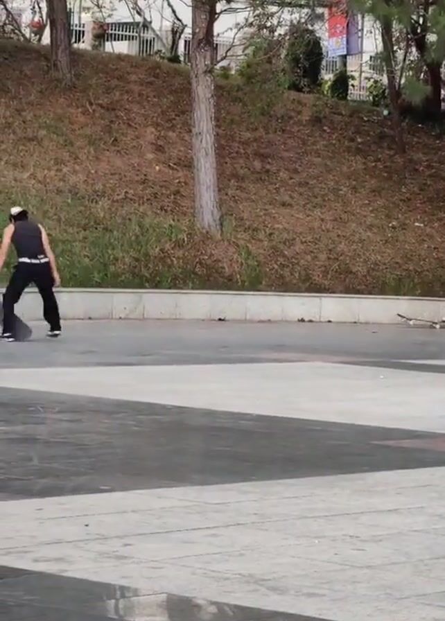 person skateboarding in an outdoor concrete plaza. The skateboarder, wearing a black tank top, black pants, and a white hat, attempts a trick and lands the skateboard on its side. The skateboarder then walks towards a person with their shirt off wearing white pants. Next to that person, another person is wearing a black shirt and black pants and is standing near a white skateboard. The plaza is located near a green grassy hill with trees.