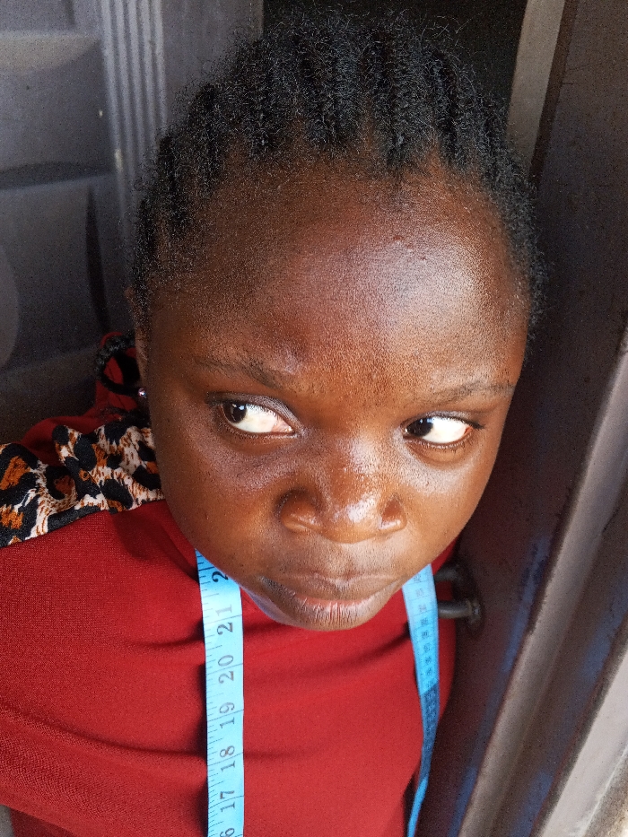 The image displays a close-up, high-angle portrait of a female individual. She has dark skin, and her hair is styled in short, dark braids or cornrows. Her dark eyes are directed upwards and slightly to the viewer's left, maintaining a neutral expression. She is dressed in a deep red garment, featuring a section of black and brown animal print fabric visible on her left shoulder. A blue measuring tape, marked with white numbers ranging from 16 to 21, is draped around her neck, resting on the red garment. The background is dark and indistinct, indicating an indoor setting. A vertical element with ridges is partially visible on the left, alongside a plain, darker vertical surface on the right. No specific visual identifiers within the image allow for the determination of a precise location within the city of Akwanga, Nigeria.