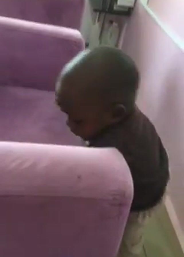A young child in a long-sleeved brown shirt and light-colored pants stands beside several purple armchairs. The child leans into one of the chairs, briefly resting their head on the armrest, before looking down at their hands and fiddling with them. The room has a pink wall, a tile floor, and a small shelf with various items on it.