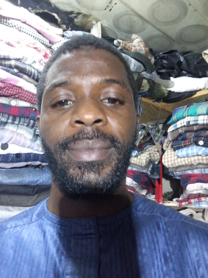 An adult male is depicted in a close-up portrait, situated in the city of Maiburiji, Nigeria. He has dark skin, short dark hair, a full beard, and a mustache, and is wearing a dark blue, collarless shirt. His gaze is directed forward, toward the camera. The background is filled with numerous stacks of folded clothing, predominantly plaid and checkered shirts, arranged on shelves. Above the merchandise, a ceiling or wall section features a textured pattern with circular motifs. Black plastic bags and a red object are discernible amidst the clothing in the upper right background. The environment suggests an indoor retail setting, likely a clothing stall or shop.