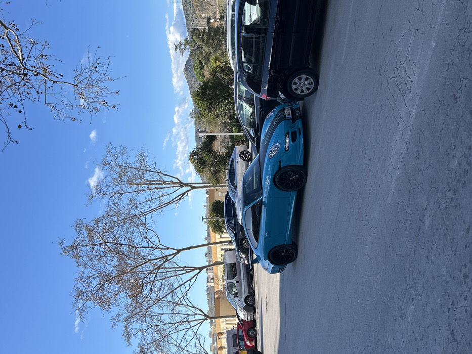 The image depicts an outdoor parking area in Badalona, Spain, under a clear blue sky with scattered white clouds