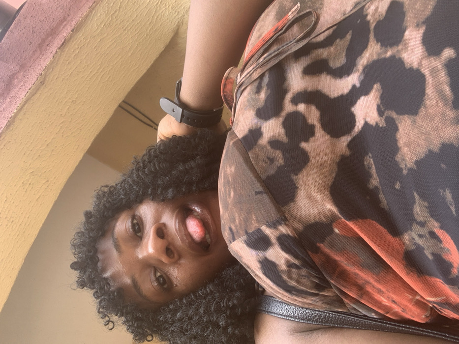 A low-angle, close-up image depicts a single female subject in Enugu, Nigeria, looking directly upward into the camera with a playful expression. Her dark skin is visible, and she has black, curly hair styled with prominent individual twists or curls. Her mouth is open, with her tongue extended outward. She is wearing a sleeveless top or dress featuring a brown, black, and orange animal print pattern. A black digital watch is present on her right wrist, and a black strap, likely from a bag, is visible over her left shoulder. The background consists of a textured building wall, predominantly painted a light yellow-orange, with a distinct darker reddish-brown section appearing behind her head and to the upper right.