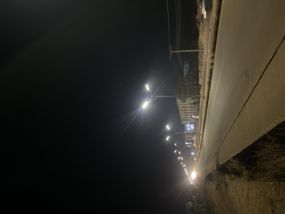 A night scene depicts a road illuminated by a series of streetlights receding into the distance. The road surface is visible on the right, bounded by a low concrete barrier and sparse vegetation. Tall electric poles stand alongside buildings, diminishing in size as they extend toward the end of the frame. The sky is black, suggesting nighttime. Light flares around the streetlights.
