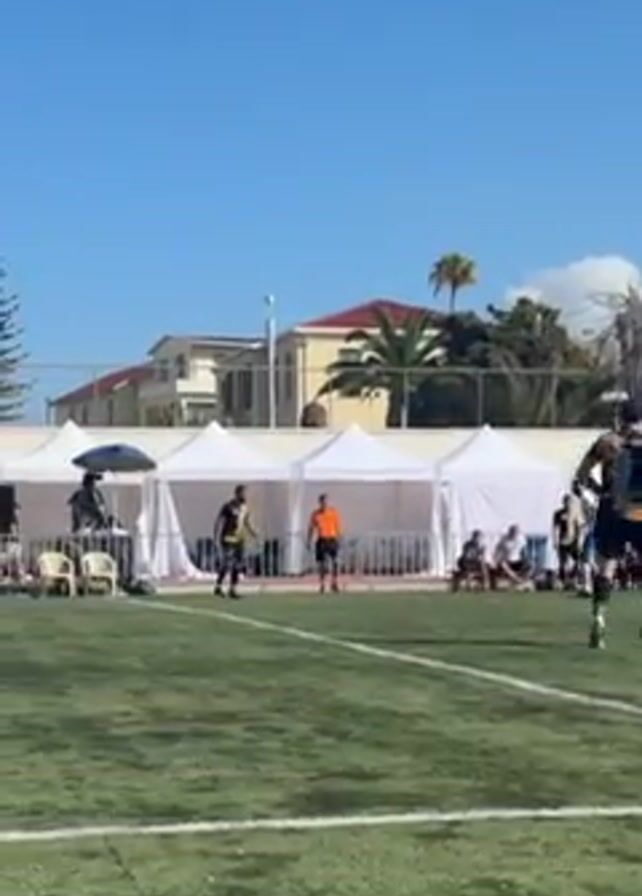 soccer player on a green field kicking a soccer ball. The player is wearing a black jersey with yellow accents and the number "3" on the back. He is facing away from the camera and towards the right side of the frame. In the background, there are several white tents, people sitting in chairs, and buildings with palm trees. The sky is blue and clear. The camera follows the player as he kicks the ball. Other players, some wearing blue and white and one wearing orange, are in the distance on the field. There is a tall antenna visible on the right side of the shot.
