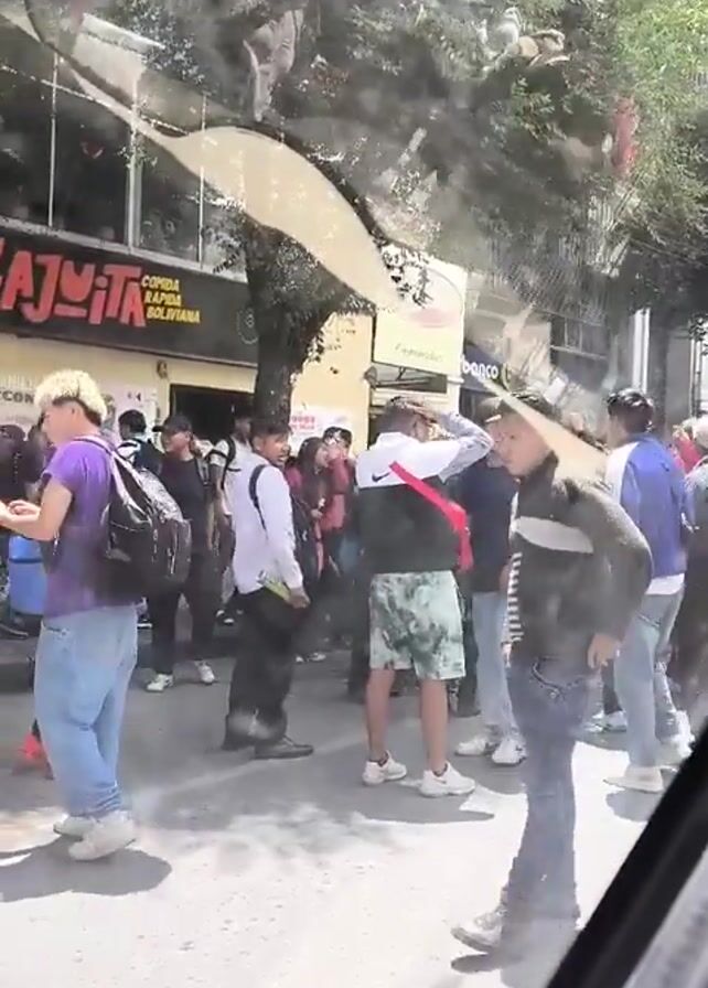 view from inside a vehicle, looking out at a crowded street scene. A group of people are standing on the street, some seemingly in conversation. One individual stands out, wearing a purple t-shirt with white text and light-colored jeans, and blond hair. Behind the group of people is a building with a sign that reads "LAJITITA COMIDA RAPIDA BOLIVIANA". A motorcycle is parked in the foreground, partially obstructing the view. The street is paved and appears to be in an urban setting. The sunlight creates strong shadows on the ground and reflections in the vehicle's window, making it difficult to see details in the background.