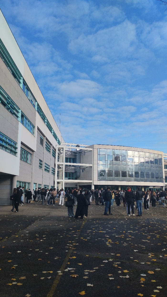 The image displays an exterior scene at a modern educational campus in Bischheim, France, under a clear blue sky with scattered white cumulus clouds. The foreground consists of a dark paved surface extensively covered with fallen yellow and brown autumn leaves. Two multi-story buildings dominate the background. The structure on the left features a light grey facade with numerous horizontal bands of teal-framed windows and white trim, from which a slender antenna extends upwards. The building on the right presents a contemporary design with a large, reflective glass facade that mirrors sections of trees and the sky. A multi-level, open-frame structure with white support beams connects these two primary building sections. Numerous individuals, predominantly young adults or teenagers, are distributed across the paved area in front of the buildings. They are casually dressed in various outerwear, including jackets and coats, and are observed standing in groups, conversing, and walking. The overall impression is a student gathering during daylight hours.