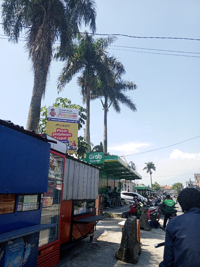 The image displays an outdoor street scene in Multhan, India, under a clear blue sky with minimal cloud cover. In the foreground to the left, a two-toned street stall, predominantly blue with red elements and a corrugated metal top, presents goods through a glass-fronted display. Directly behind and above the stall, three tall palm trees with dark trunks and green fronds are prominent. Positioned between two of these trees is a large rectangular billboard featuring "MAXIM" and "Grab" branding, alongside text in a foreign language referencing "POLRI." To the right of the stall, a green structure marked "Grab PICK UP POINT" extends along the street. Beneath this canopy, a group of approximately five to seven individuals, several identifiable by green jackets with the "Grab" logo, are gathered; some are seated on benches, others stand. A paved street runs from left to right, where numerous motorcycles are parked in a line. A silver sedan is also visible among the parked vehicles. Segmented concrete barriers are present along the roadside. In the immediate foreground to the right, the back of a person with dark, curly hair, wearing a dark garment, is visible, facing away from the viewer, positioned as if on a motorcycle. The background shows additional buildings lining the street and distant topographical features.