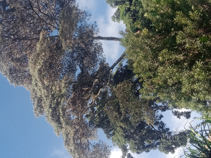 A tilted upward view showcases two trees against a blue sky with scattered white clouds. The tree on the left features dense foliage with a silvery or muted green hue. The tree on the right boasts dark green, lush leaves. Branches from both trees intermingle, creating a canopy. Some vegetation is visible in the lower right corner, outside the trees’ immediate vicinity.