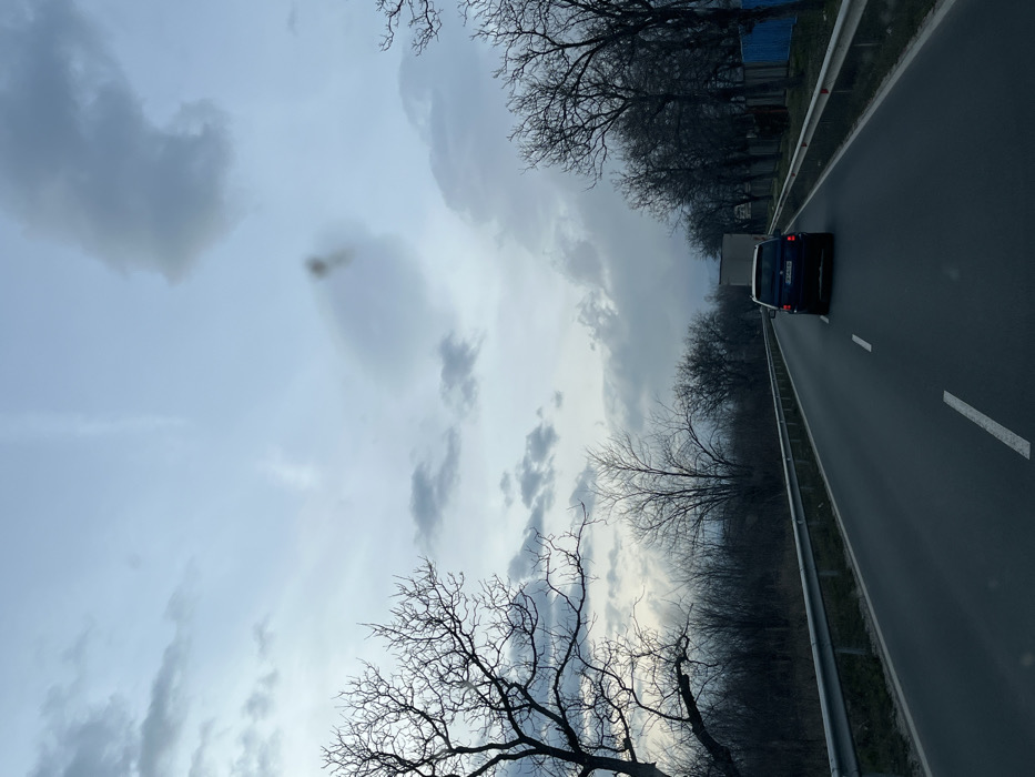 The image depicts a two-lane asphalt road in Iganovo, Bulgaria, viewed from inside a moving vehicle. The weather is overcast, with a sky composed of light blue and various shades of grey clouds. A dark, irregular mark is visible in the upper-middle sky area. A dark-colored minivan or small SUV, bearing Bulgarian license plate "P 8466 BC", travels in the right lane, moving away from the viewer. Ahead of this vehicle, a light-colored truck or trailer is partially visible on the right side of the road. Metal guardrails line both sides of the asphalt, which is marked with a broken white center line. Beyond the guardrails, numerous leafless deciduous trees line the road, indicating a period outside of the growing season. A light blue corrugated fence or structure is partially visible on the far right, behind the trees and guardrail. No individuals are visible.