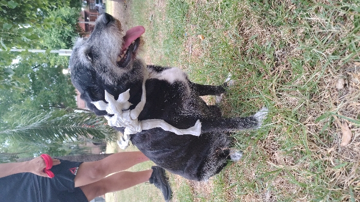 A black and white dog sits on grass with its tongue out. The dog has a white garland around its neck. A person wearing black shorts and sneakers stands next to the dog. Trees and a building are visible in the background. The scene appears to be outdoors on a sunny day.