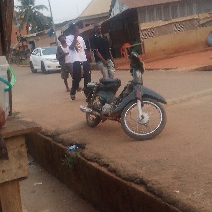 An older motorcycle sits parked on the side of a street. The motorcycle's body is mostly black, with a chrome front tire and exhaust pipe. Behind the motorcycle, three young men are walking in the same direction, one is in a white shirt, black pants, and sneakers. A white sedan is visible further down the street. Buildings with corrugated metal roofs line the street and a few people are on porches. The street surface is cracked and reddish. A ditch is in the foreground.