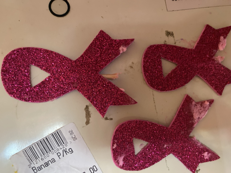 The scene, located in Kawo, Nigeria, displays three pink glitter-covered ribbon decorations resting on a light-colored, flat surface. The ribbons are shaped like the iconic breast cancer awareness symbol. The top-center ribbon has a thin, light-colored stick protruding from its base, indicating it may be a cake topper or similar decorative item. All three ribbons exhibit areas of light pink or white residue, consistent with frosting or adhesive, particularly on their lower tips and edges. In the upper-left corner, a crumpled white label is partially visible. This label features a black barcode and legible text including "Banana P/Kg" and "SC.92". A small, black, circular object, possibly a rubber band or gasket, is situated in the upper-right portion of the frame. Irregular, dark brownish-green smudges or debris are present on the light surface, particularly beneath the top ribbon and between the two lower ribbons. No individuals are depicted, and no specific actions or interactions are occurring within the frame.