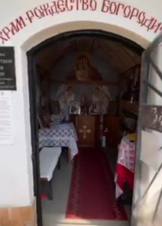 interior of a small, ornate Christian Orthodox chapel. The camera slowly pans from the doorway into the small room. The entrance arch is labeled "ХРАМ РОЖДЕСТВО БОГОРОДИ" in red lettering. The interior features religious iconography including paintings on the curved ceiling depicting biblical scenes and saints. A red carpet runs down the center of the room. There are tables with white cloths and red decorations on each side of the carpet. The walls are lined with numerous religious icons displayed on shelves. A small altar with a cross sits at the far end of the chapel. The chapel appears well-maintained and reverent.