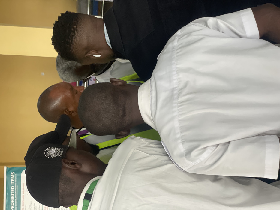 Five adult males are observed clustered together in an indoor setting within the city of Kwi, Nigeria. All individuals are oriented towards a central, downward-facing point, suggesting shared focus on an unseen object or discussion. From the rear, two men in white short-sleeved shirts are prominent; the individual on the left has a green and white striped lanyard visible on his right shoulder, while the man on the right wears a shirt with visible epaulets. Partially obscured to their left is a man wearing a black baseball cap featuring a white "TORONTO ALL STAR GAME" logo, a white undershirt, and a bright yellow-green reflective vest. A bald man is positioned centrally, leaning forward with his face largely obscured. On the right, a man with dark, short-styled hair is visible from the back, wearing a dark jacket, with a white earbud in his right ear. A man with gray hair is partially visible behind the bald individual. The background features a green sign with white text, partially legible as "PROHIBITED ITEMS" and "Pistols, Guns and Weapons," indicating a controlled or security-related area. The surrounding walls are a light yellowish-beige, and a blue horizontal strip is visible in the mid-right background. The scene suggests an official or operational environment.