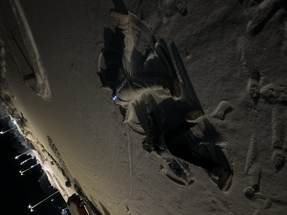 Two figures in snow, possibly adults, are illuminated from the front