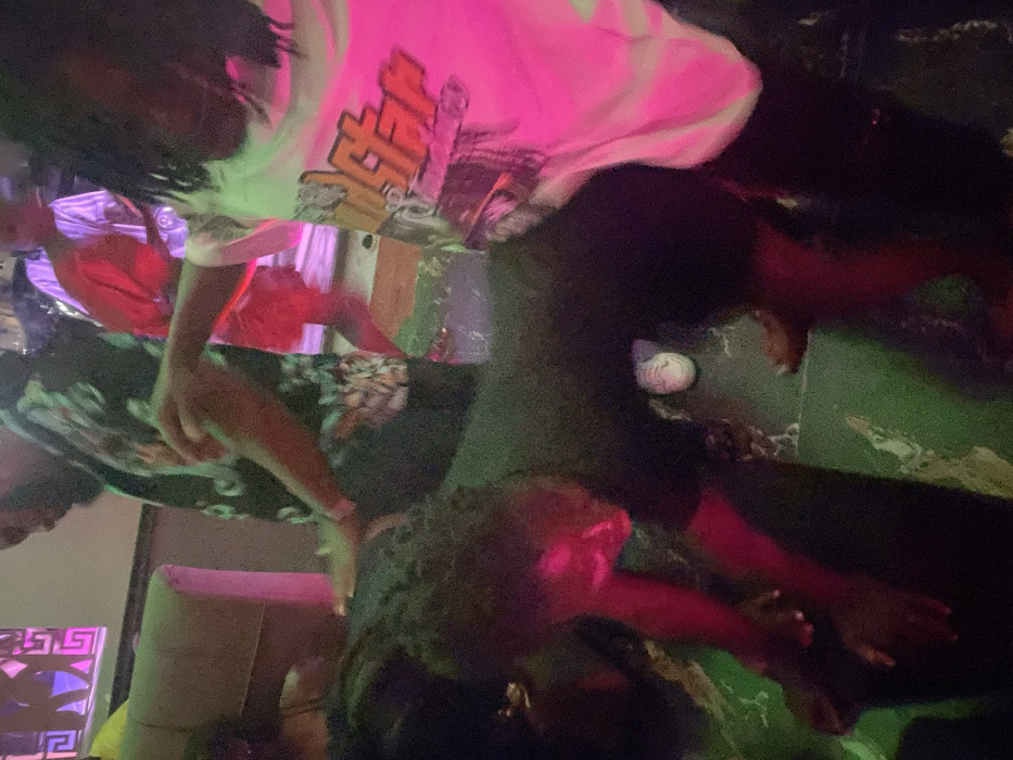 A dimly lit indoor setting shows two people. One wears a white T-shirt with an orange design. Dark pants and brown shoes are visible. The second person is clad in a dark, patterned shirt. Two arms are seen with visible rings or bracelets. A beige couch is in the frame. A white circular object is on the floor. The lighting is pink and green. The image is rotated.