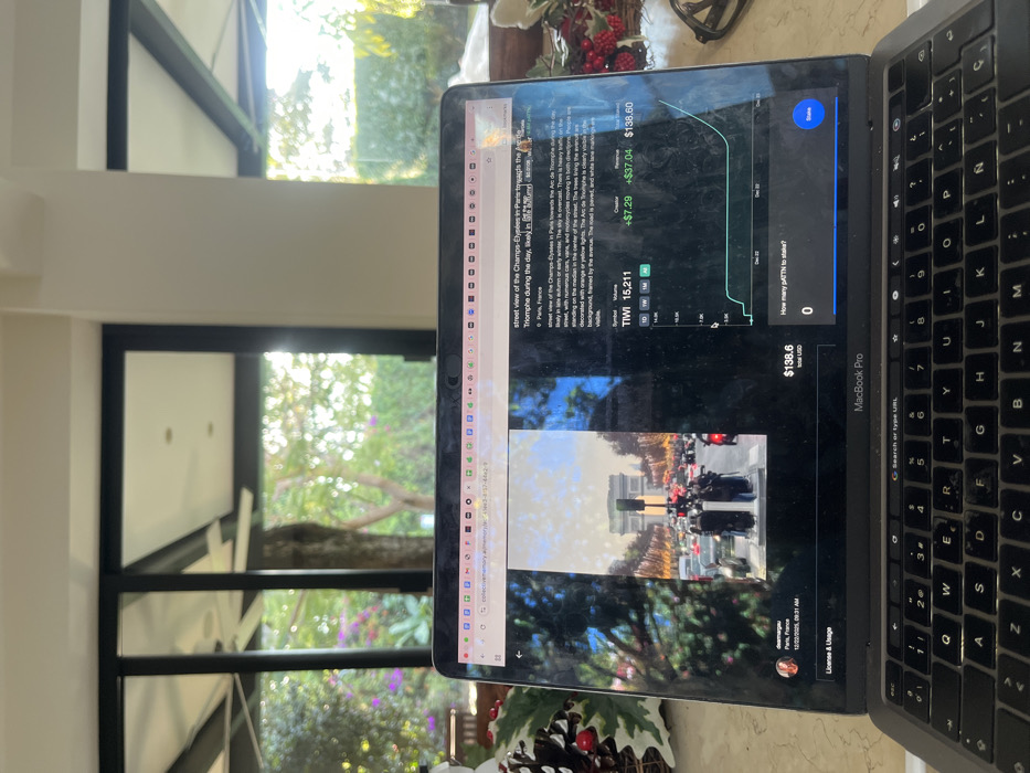 The image displays a silver MacBook Pro laptop positioned on a light-colored, granular surface, likely a tabletop, in Tetela Del Monte, Mexico. The laptop screen is active, showing a web browser with multiple open tabs. The primary content on the screen is a vertical image depicting the Arc de Triomphe in Paris, France, from a street-level perspective on the Champs-Élysées, with vehicles and indistinct pedestrian figures on the street during daytime. Text accompanying this image on the screen provides a description of the Paris location and displays financial data, including "Symbol: TIMI", "Volume 15,211", and a "Total USD" value of "$138.60" with an associated upward trending graph. A prompt asks "How many pATTN to stake?", showing "0" and a "Stake" button. The image creator is identified as "dearmargau" with a timestamp of "12/03/2023, 09:31 AM". To the left of the laptop, a decorative arrangement with a brown pinecone, green foliage, and red berries is visible. To the right, a pair of dark-framed eyeglasses rests on the surface. The background reveals an outdoor environment seen through large, black-framed windows or glass doors. This view encompasses abundant green foliage, trees, and blooming purple flowers under a bright, natural light, indicating daytime. White architectural elements, including a ceiling and what appears to be a partial ceiling fan, are visible through the glass.