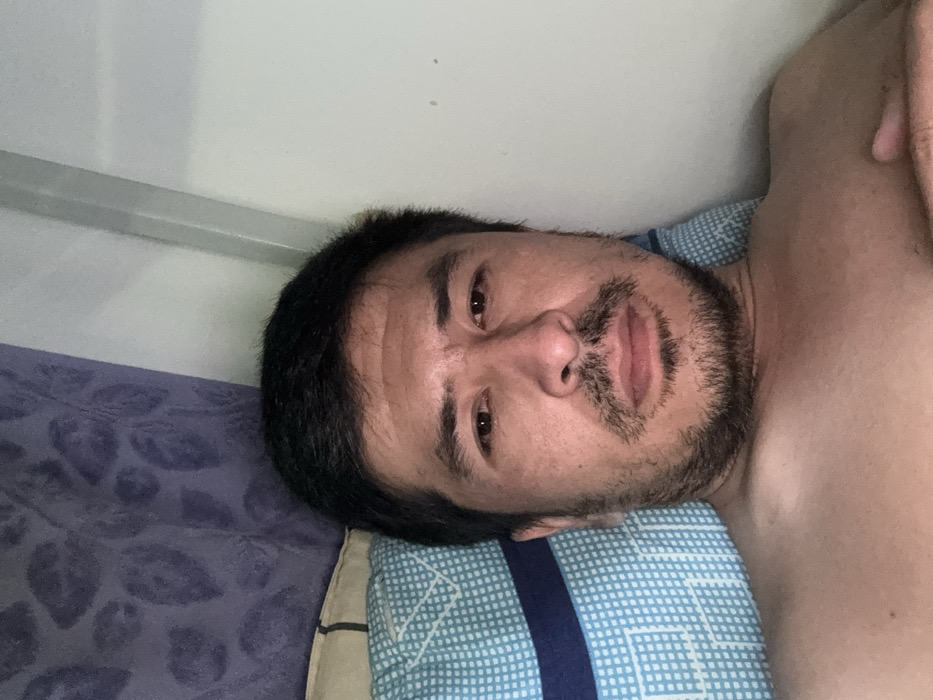 A shirtless man with dark hair and a salt-and-pepper beard lies on a blue patterned pillow