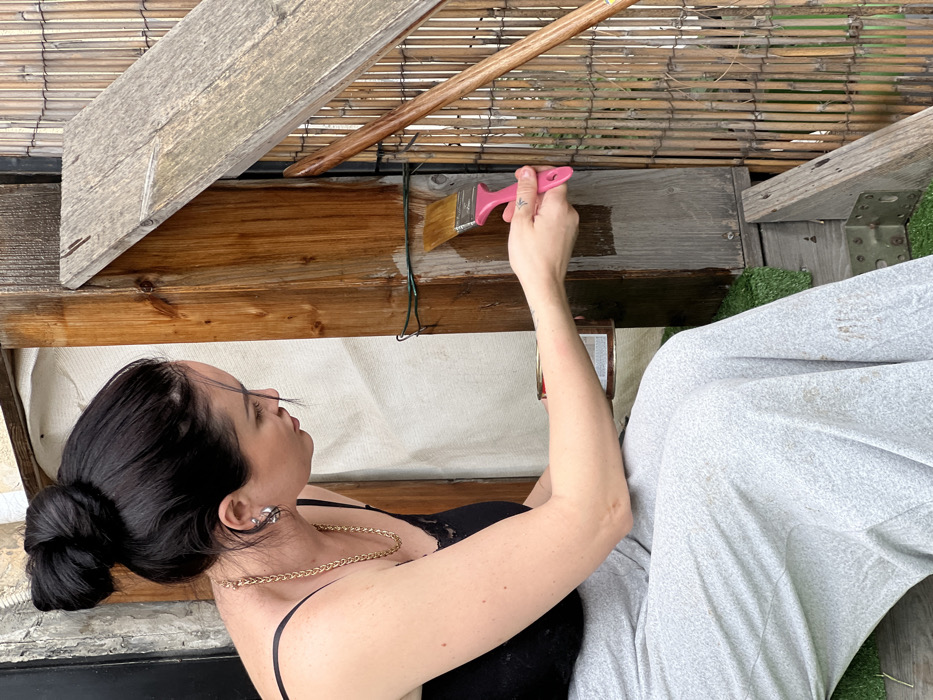 An adult female is captured in a three-quarter profile, seated outdoors in Kiryat Yam, Israel. She possesses dark hair styled in a high bun and is dressed in a black, lace-trimmed spaghetti strap top, a gold-colored chain necklace, and light grey sweatpants displaying stain marks. Her right hand operates a pink-handled paintbrush, applying a dark brown wood stain or varnish to a vertical wooden beam. A red-labeled can, containing the wood treatment, is positioned near her left hand. The wooden beam exhibits a distinct contrast between its original light brown surface and the applied darker stain. An angled wooden plank, partially stained, abuts the beam. To the right, a tightly woven vertical bamboo screen serves as a backdrop, with a wooden handle or rod leaning against it. Artificial green turf is visible on the ground beneath the wooden structure, which also includes a metal L-bracket. A green electrical wire is loosely secured to the wooden beam. The woman's attention is directed downwards, focused on the task of staining the wood.